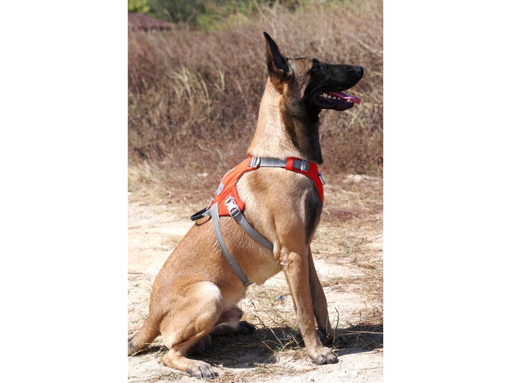 Postroj na psa ušitý z kvalitních materiálů. Plně nastavitelný. Vnitřní strana s měkkým polstrováním, které umožňuje výměnu vzduchu. Postroj ušitý dle nejnovějších trendů plně vyhovuje anatomii psa a nijak ho neomezuje v pohybu. Přídatný pásek slouží k důkladnějšímu upevnění na těle psa. Brání ve vyvlečení psa z postroje. Vhodný pro každodenní venčení, výcvik i na cesty do náročnějšího terénu, kdy je potřeba psa jistit. Má i očko na spodní straně postroje pro omezení tahání na vodítku. Lze prát v pračce.