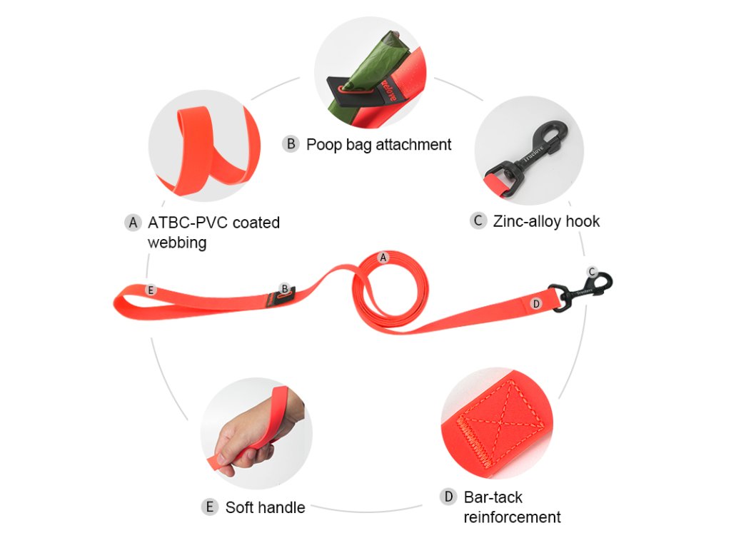 Moderní omyvatelné vodítko z měkkého PVC (ATBC-PVC se používá i k výrobě hraček a v potravinářství.) Vhodné do deštivého počasí. Délka 2 m.